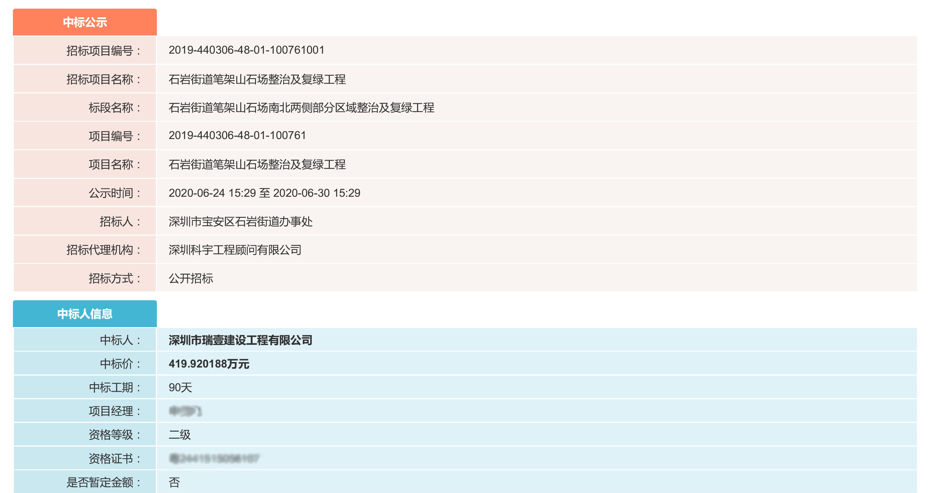 热烈庆祝深圳市瑞壹建设有限公司成功中标“龙岗区第二人民医院变压器扩容更新改造工程”、“石岩街道笔架山石场整治及复绿工程”两个项目。