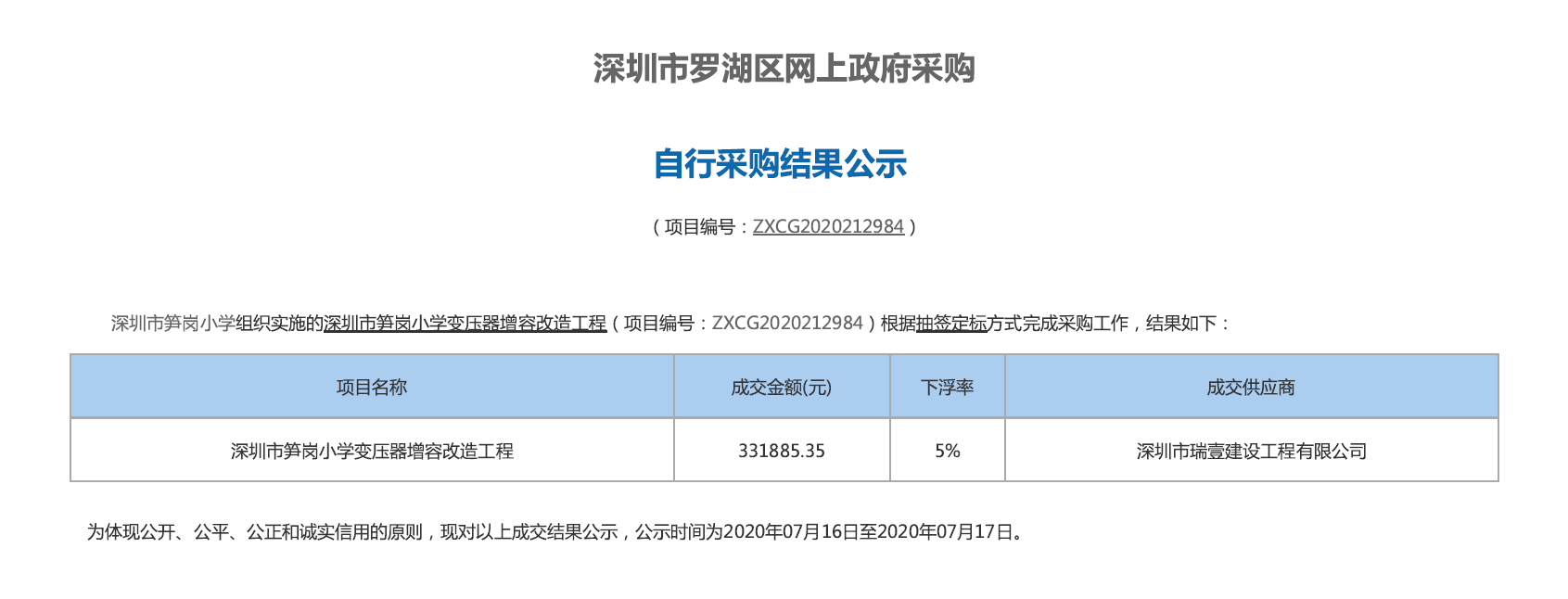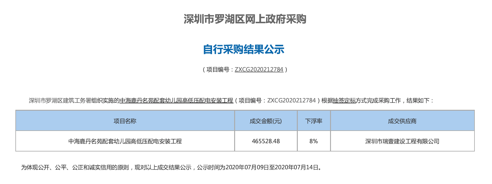 深圳市瑞壹建设工程有限公司再传捷报!成功中标“中海鹿丹名苑配套幼儿园高低压配电安装工程”、“深圳市笋岗小学变压器增容改造工程”两个项目。