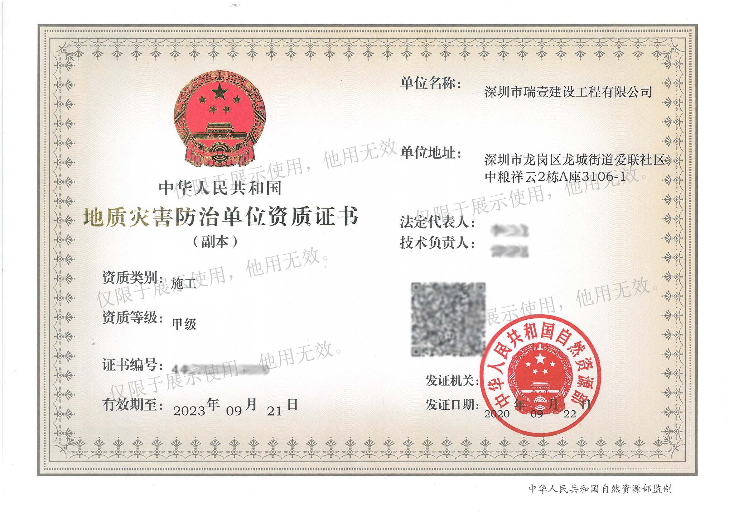 近日,深圳市瑞壹建设工程有限公司(以下简称瑞壹公司)获中华人民共和国自然资源部颁发的“地质灾害防治施工甲级”资质。这是今年瑞壹公司资质升级工作方面的又一重大突破,为企业的长远发展打下坚实的基础,是瑞壹公司发展史上的里程碑。